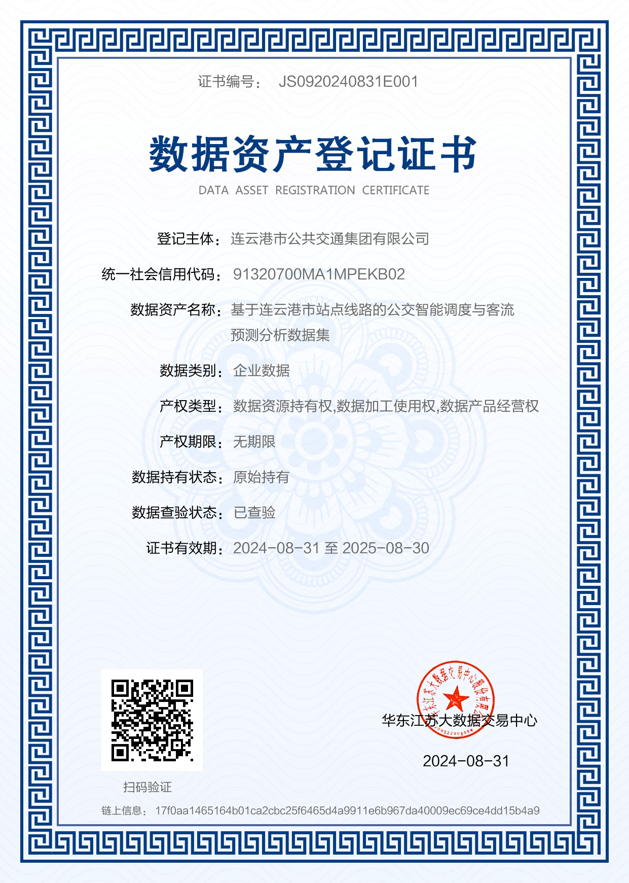 为保障数据资产价值化全流程顺利推进,连云港公交精心筛选出“基于连云港市站点线路的公交智能调度与客流预测分析数据集”作为价值化的核心标的。这一数据集不仅包含了公交调度数据、定制公交数据、电子站牌信息等关键信息,还涵盖了客流量、车流量等重要数据,为公交的运营决策提供了强有力的数据支撑。经过严谨的评估,该数据集的数据质量得分高达98.36分,评估价值达到1750万元。目前,正在与金融机构进行对接,即将获得融资授信,深入推进数据要素价值多元化释放。