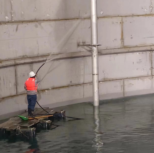 为确保水压试验安全、高效、平稳进行,信泰公司提早谋划方案、梳理注意事项。为防止水质不达标对储罐造成损伤,信泰公司对水质进行了多次检测,并对每日入罐脱盐水水量进行严格控制。在水压试验过程中,信泰公司职工续加班8天,日夜奋战在施工一线,以24小时轮流值班的形式进行管理与监督。