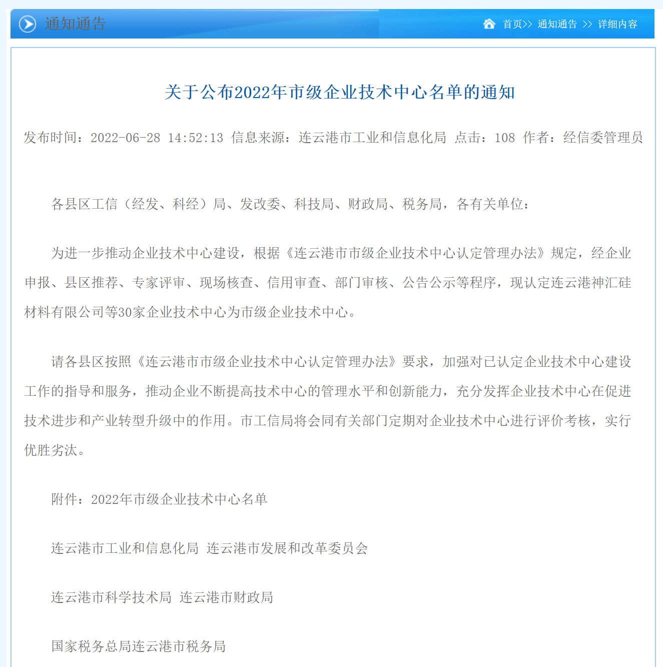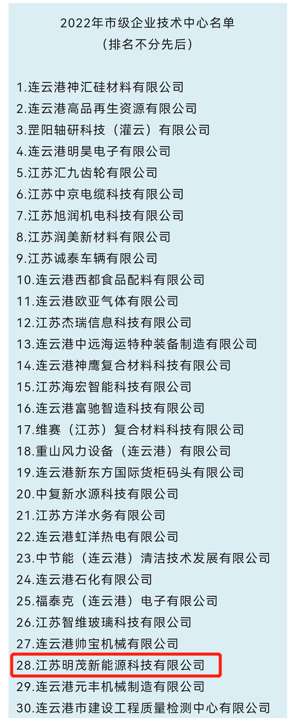 628日,连云港市工业和信息化局在官方网站发文,根据《连云港市认定企业技术中心管理办法》,认定明茂公司为2022年连云港市企业技术中心。