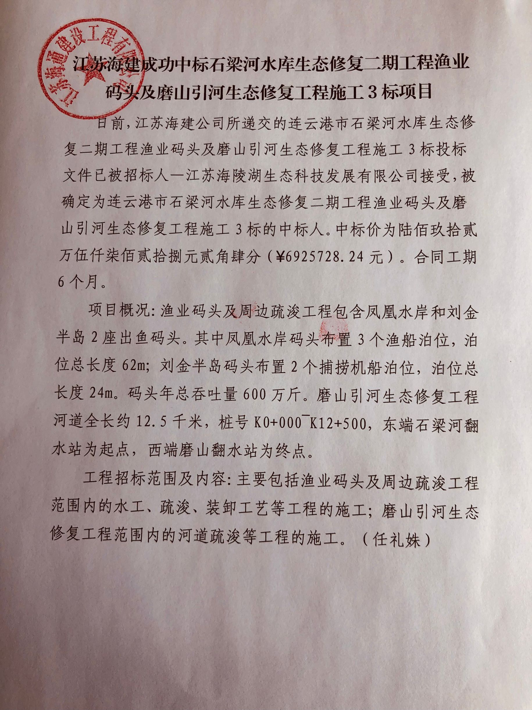 日前,江苏海建公司所递交的连云港市石梁河水库生态修复二期工程渔业码头及磨山引河生态修复工程施工3标投标文件已被招标人—江苏海陵湖生态科技发展有限公司接受,被确定为连云港市石梁河水库生态修复二期工程渔业码头及磨山引河生态修复工程施工3标的中标人。中标价为陆佰玖拾贰万伍仟柒佰贰拾捌元贰角肆分(¥6925728.24元)。合同工期6个月。