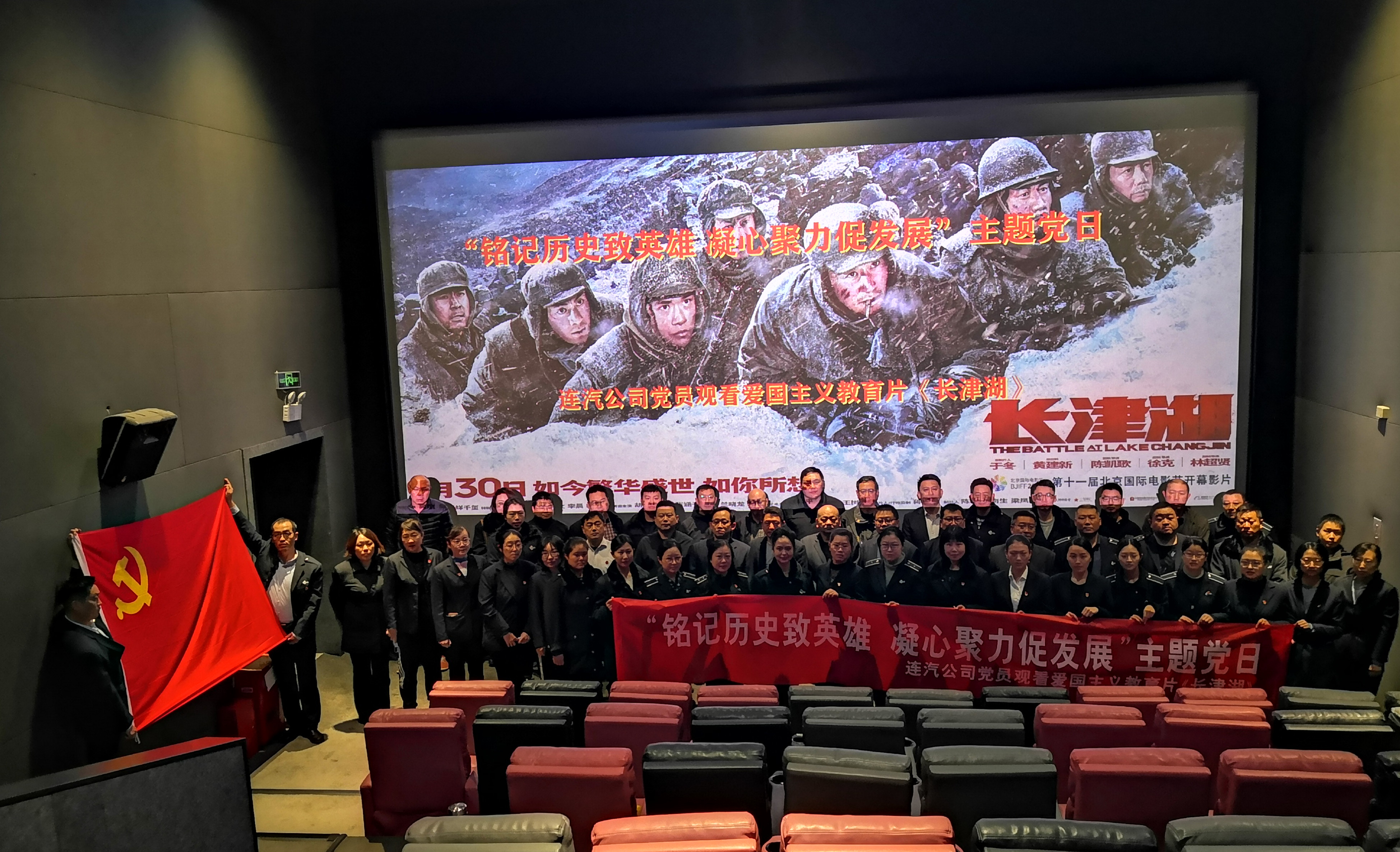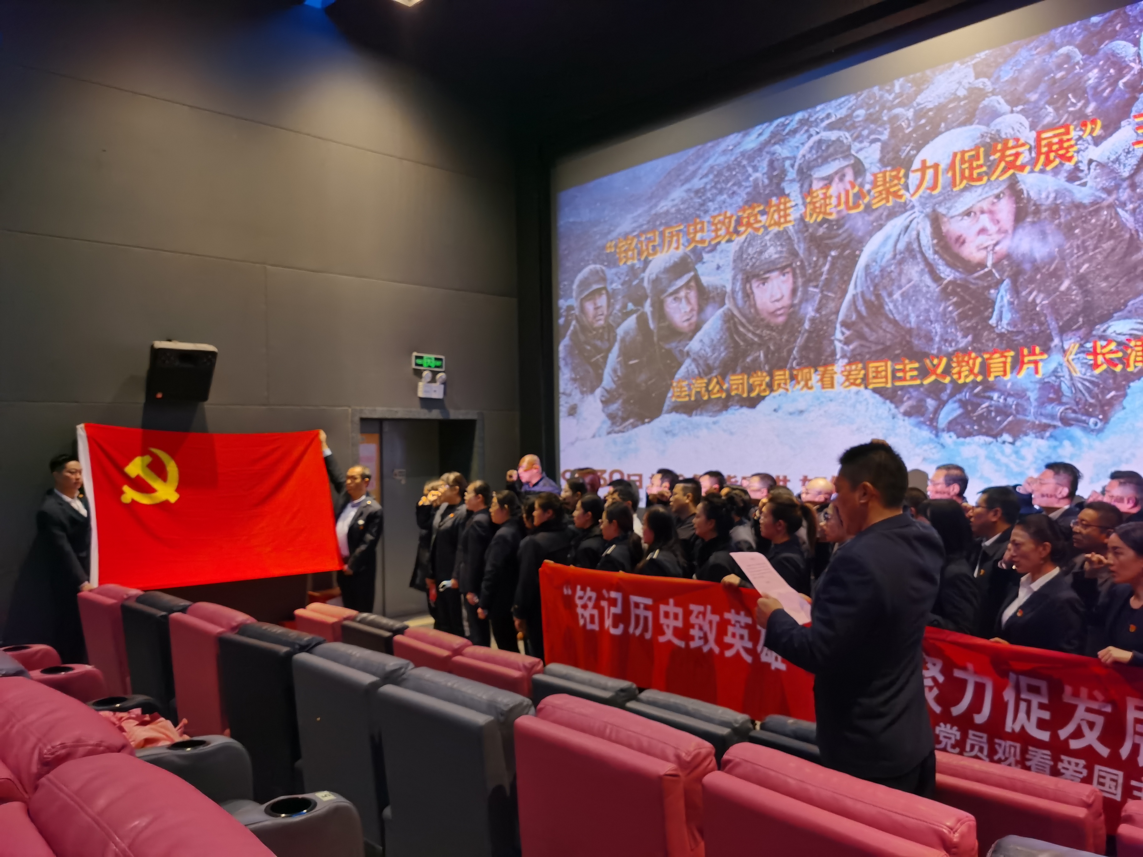 为弘扬爱国主义精神,进一步扎实推进党史学习教育走深走实,激发广大党员的自豪感和使命感,提升党员的凝聚力、向心力,以决战决胜姿态全力冲刺四季度,确保圆满完成全年目标任务,116日,汽车公司开展“铭记历史致英雄  凝心聚力促发展”主题党日活动,组织党员观看抗美援朝题材影片《长津湖》,为大家上一堂生动的爱国主义党课,公司党员及积极分子共50余人参加。观影前,全体党员重温入党誓词,嘹亮的声音响彻影院。